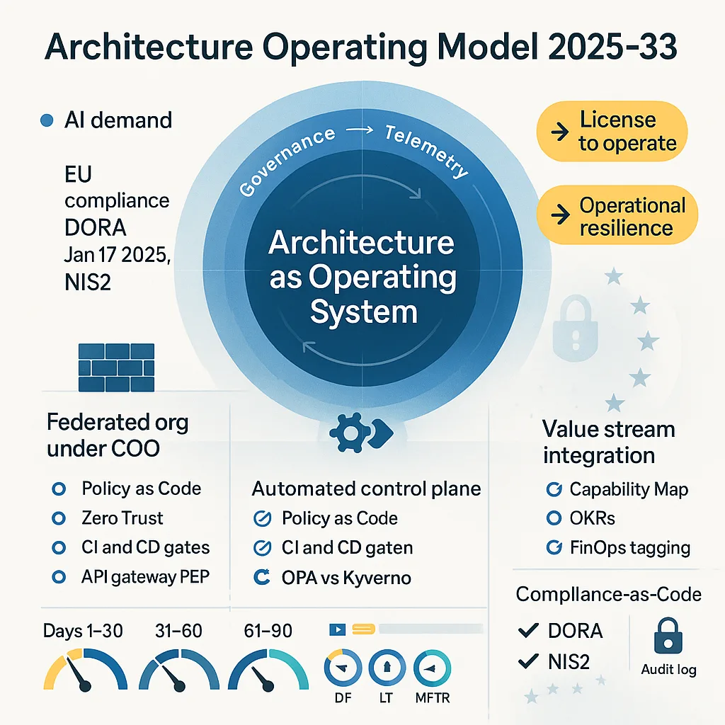 Dit rapport definieert het Architecture Operating Model (AOM): een raamwerk dat EA transformeert van een passieve documentatiefunctie naar een actief, geautomatiseerd besturingssysteem. De kerntransformatie van het AOM is het vertalen van abstracte architectuurprincipes en compliance-eisen naar machineleesbare, afdwingbare policies (Policy as Code).16