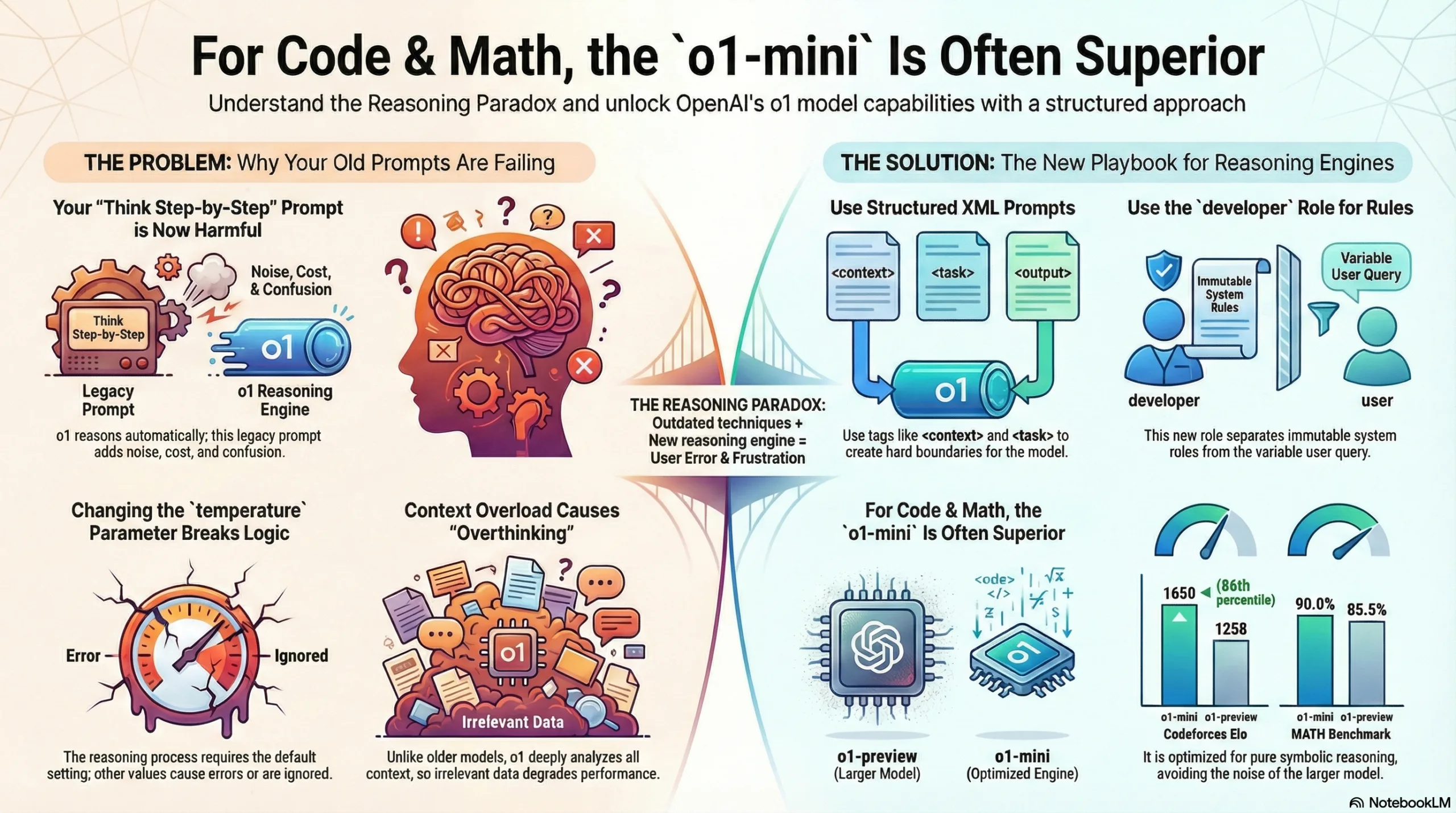 This report establishes that this disconnect—this “Reasoning Paradox”—is not a failure of the model’s underlying architecture, but rather a catastrophic misalignment of the user’s mental model. The prevailing heuristics of “Prompt Engineering 1.0,” which were developed and refined for pattern-matching models like GPT-3.5 and GPT-4, are not merely ineffective when applied to reasoning models like o1; they are actively detrimental. Techniques such as chain-of-thought prompting, temperature tuning for creativity, and massive context dumping are effectively fighting the model’s internal optimization processes.7
